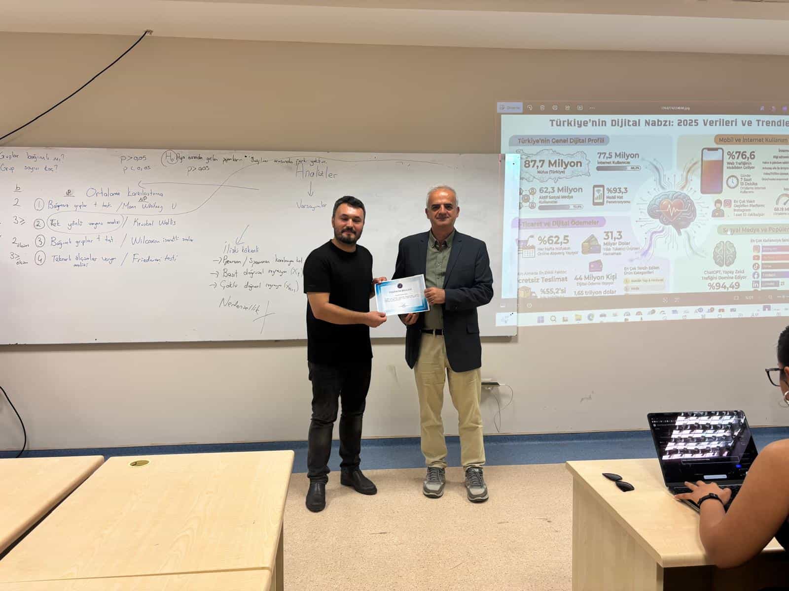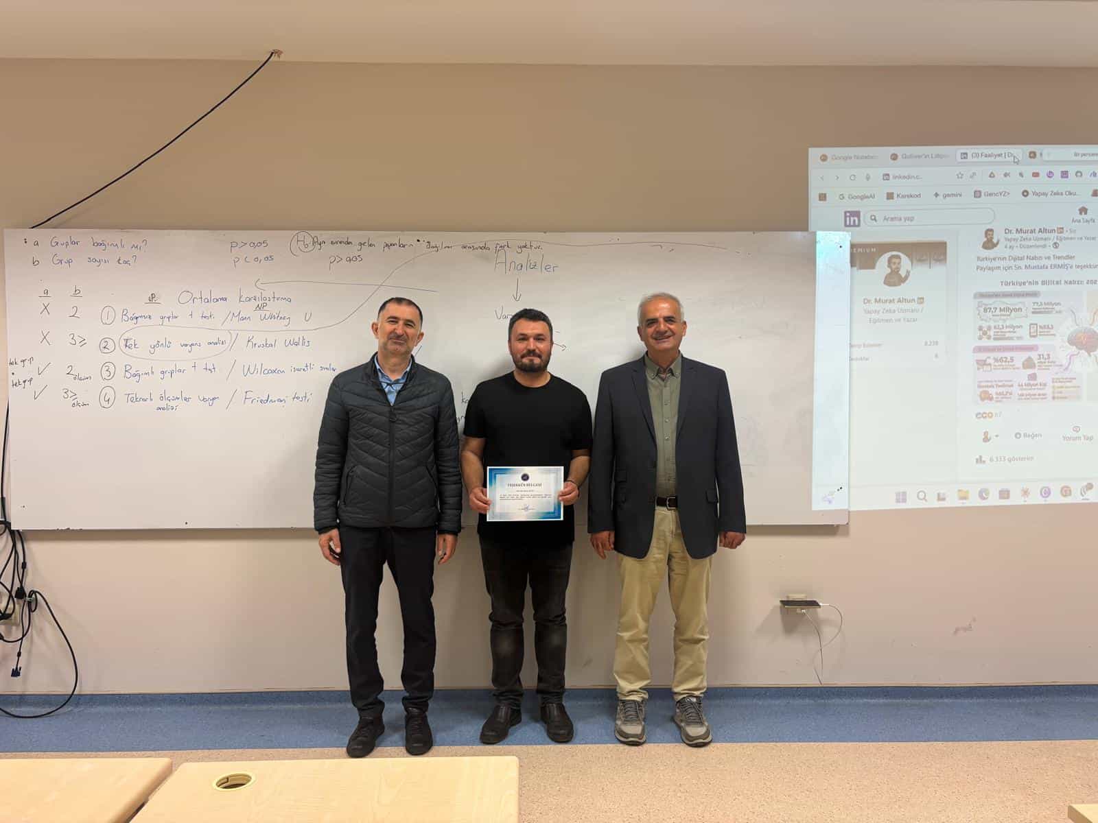 Eğitim programının sonunda, toplamda 25 katılımcıya sertifikaları verildi. Sertifikaları Eğitim Fakültesi Dekanı Prof. Dr. Hilmi Demirkaya, Dekan Yardımcısı Doç. Dr. Ali Özkaya ve Eğitmen Dr. Murat Altun birlikte takdim etti. Katılımcılar, program sonunda memnuniyetlerini dile getirdi.