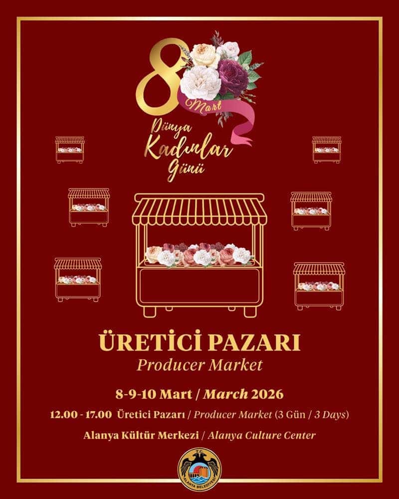 8 Mart Pazar günü saat 12.00’de Alanya Kültür Merkezi (AKM) Dış Fuaye Alanında açılacak olan Üretici Pazarı, üç gün boyunca ziyaretçilerini ağırlayacak. Pazarda, Alanya Belediyesi ve İlçe Halk Eğitim Merkezi iş birliğiyle düzenlenen el sanatları kursiyerleri, Noel Pazarı ve Turizm Festivali katılımcıları, Yeni Alanyalılar Platformu sanat komitesi üyeleri ile ilçede görev yapan üç kadın muhtarın bölgelerinden üreticiler stant açacak.