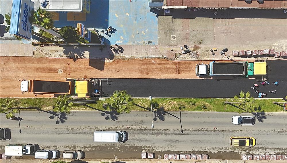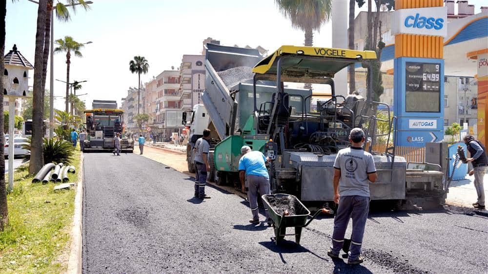 Atatürk Caddesi’nde, Alanya’nın önümüzdeki 50 yılına dönük planlamalar kapsamında, altyapısı tamamlanan yolun asfaltlama çalışmaları iki adet finişer ile gerçekleştiriliyor. Güzelyalı Caddesi’nden sonra, Kale Market karşısında stabilizasyonu tamamlanan kısımda sıcak asfalt serimine geçildi. Serim işlemlerinin İlçe Milli Eğitim Müdürlüğü kavşağına kadar kısa sürede tamamlanması hedefleniyor.