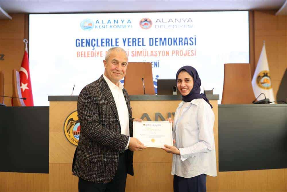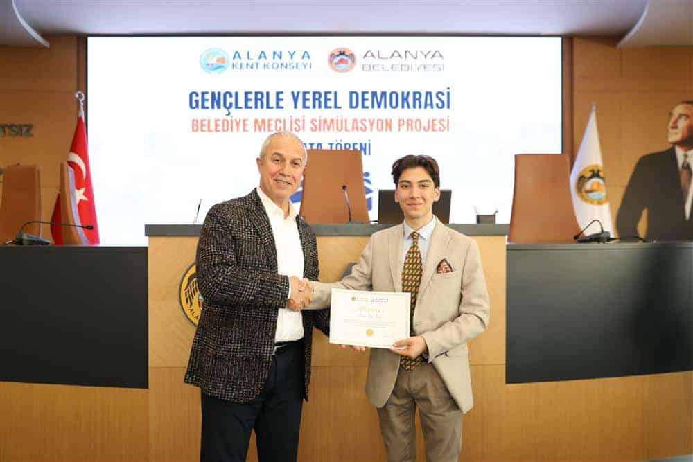 Alanya Belediyesi ve Alanya Kent Konseyi iş birliğiyle başlatılan meclis simülasyonu projesi, düzenlenen mazbata töreniyle hayata geçirildi. Alanya Belediye Meclis Salonundaki törende Belediye Başkanı Osman Tarık Özçelik, Kent Konseyi Başkanı Nurhan Özcan, Genel Sekreter Haydar Uyar, Gençlik Meclisi Başkanı Kazım Arı ile projeye seçilen genç meclis üyeleri hazır bulundu. Törenin sonunda genç üyeler, mazbatalarını Başkan Özçelik’in elinden aldı.