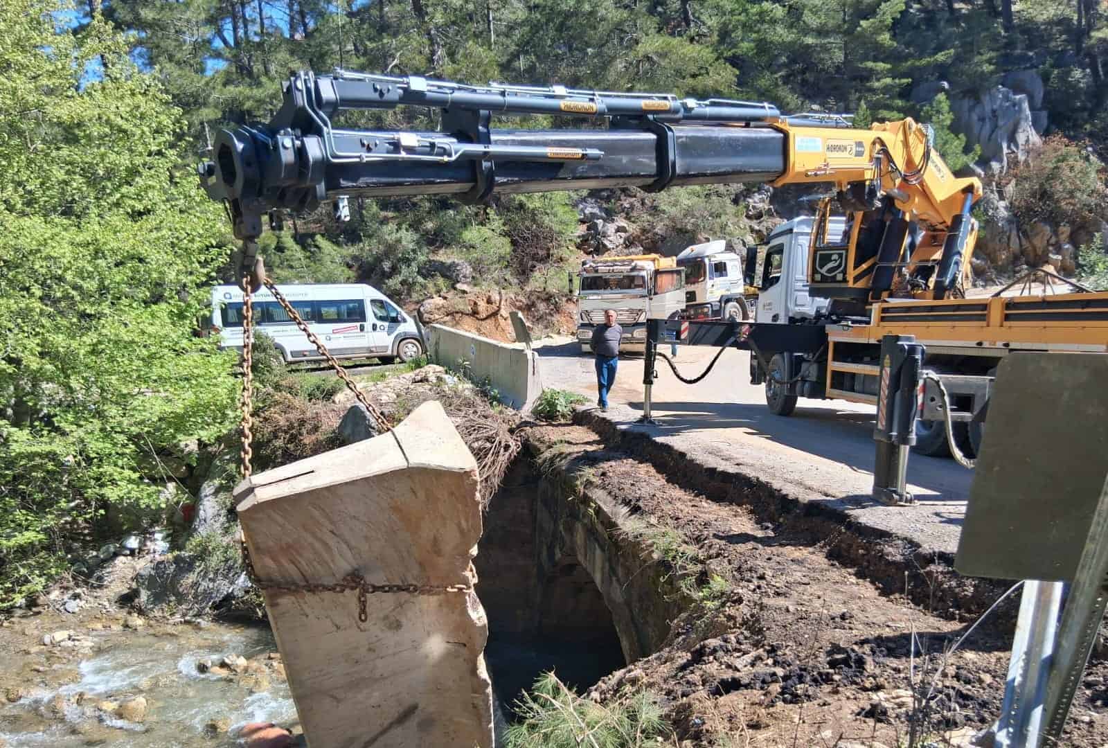 Antalya Büyükşehir Belediyesi, Demirtaş Vadisi’nde bulunan ve 23 mahalle ile Gazipaşa sakinlerinin sıklıkla kullandığı grup yolu üzerindeki 60 yıllık köprüyü yenilemek için çalışmalarını sürdürüyor. Eski köprünün yıkılıp yerine yeni bir köprü inşa edilmesinden önce ulaşımı aksatmamak adına alternatif yol oluşturuldu. Alternatif yolun yapımında Sapadere Çayı’ndan geçen bölümde kutu menfez çalışması gerçekleştirildi ve yol üzerinde trafik, yön levhalarının montajı tamamlanarak trafik akışı sağlandı. Dolgu ve sıkıştırma işlemleri bitirildikten sonra araç trafiği servis yoluna yönlendirilerek yeni köprünün inşasına başlanacak. Eski köprünün yıkımının bu hafta içerisinde yapılması planlanıyor.