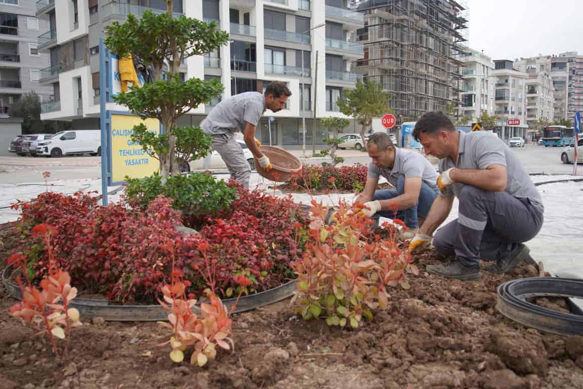 Konyaaltı Belediyesi, iklim değişikliğine uyum sağlamak ve sürdürülebilir bir çevre oluşturmak amacıyla peyzaj çalışmalarına devam ediyor. Park ve Bahçeler Müdürlüğü’nün belediye fidanlığında yetiştirilen çeşitli bitki ve çiçekler, ilçe genelindeki kavşaklarda gerçekleştirilen peyzaj uygulamaları kapsamında toprakla buluşturuldu.
